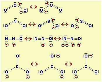 Fig.14,12 Esempi di strutture risonanti rappresentate attraverso le formule limite più probabili. L'ozono O3 ha forma angolare poiché l'ossigeno centrale ha un doppietto libero; inoltre ha una parziale carica positiva rispetto agli altri due. Il diossido di zolfo SO2, chiamato comunemente anidride solforosa, ha anch'esso struttura angolare per la stessa ragione ed i due ossigeni sono perfettamente equivalenti; nella prima formula limite S è con espansione dell'ottetto. Nel protossido di azoto N2O, lineare, l'azoto centrale è sempre tetracovalente, perciò ha sempre una carica positiva. Nello ione carbonato CO32- le due cariche negative sono equamente distribuite tra i tre ossigeni e la struttura è planare trigonale. Notare che ogni atomo (escluso S) raggiunge, in ogni formula limite, la configurazione del gas nobile (otto elettroni). |