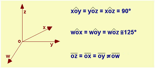 Fig.14.15 Direzione degli assi dei tre orbitali atomici p e del quarto asse che corrisponderebbe all'asse del quarto legame se i primi tre fossero formati con gli orbitali atomici p puri del carbonio per formare la molecola di metano. A destra le misure degli angoli tra gli assi; in basso a destra viene evidenziato che un eventuale legame nella direzione ow sarebbe diverso dagli altri tre. |