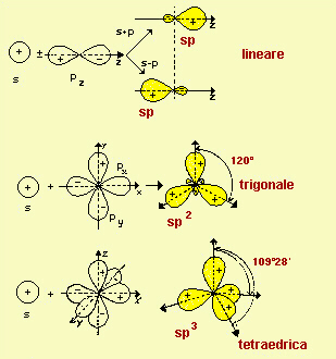 Fig.14.17 Ibridazione lineare, trigonale e tetraedrica. Il disegno mostra gli orbitali atomici utilizzati nell'operazione e gli ibridi risultanti. Sono indicati anche gli angoli tra gli assi degli ibridi, nei casi delle ibridazioni trigonale e tetraedrica e perciò anche tra i legami che con tali ibridi si possono fare. I lobi maggiori sono sempre di segno positivo e sono più adatti a formare legami rispetto agli orbitali atomici iniziali, soprattuto perché più direzionali. Nel caso dell'ibridazione tetraedrica non sono disegnati i lobi negativi per non complicare l'illustrazione. In ogni caso anche i lobi negativi si trovano sempre sullo stesso asse dei corrispondenti positivi e dalla parte opposta rispetto all'intersezione degli assi. |