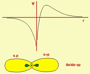 Fig.14.18 Profilo dell'ampiezza della funzione d'onda dell'ibrido sp e sua posizione rispetto alla posizione del nucleo. Nel disegno dei due ibridi sp il nucleo è rappresentato dal punto rosso. Notare che normalmente si disegnano per semplicità gli ibridi con il piano nodale passante per il nucleo, mentre invece il nucleo si trova in una zona a densità elettronica non nulla. |