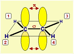 Fig.14.19 Rappresentazione della molecola di etene (detto anche etilene). I 4 idrogeni giacciono tutti sullo stesso piano, perpendicolare all'asse dei p liberi; i legami σ sono dovuti a ibridazione sp2 trigonale. Le posizioni 1, 2, 3, 4 individuano le posizioni dei singoli H. H1 e H3, se non viene rotto il legame π, restano sempre nella posizione cosiddetta cis; H1 e H4 sempre in trans. Se sostituisco chimicamente H1 con A e H4 con B, A e B saranno sempre in posizione trans (sempre purché la reazione di sostituzione non comporti la rottura del legame π). Composti cis e trans hanno reattività e caratteristiche chimico-fisiche diverse (temperature di fusione e di ebollizione, momento dipolare, ecc.). |