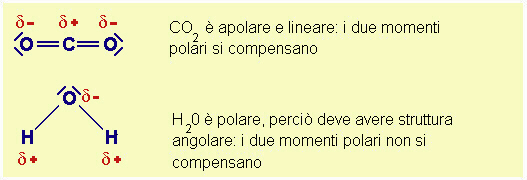 Fig.14.23 Polarità della molecola e momento polare dei legami. Nel primo esempio l'anidride carbonica o diossido di carbonio, apolare. Nel secondo esempio l'acqua, polare. La sua polarità è dimostrata da fatti sperimentali e ciò comporta che non possa avere struttura lineare. |