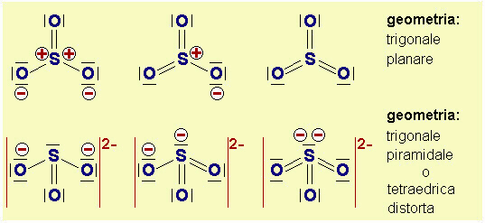 Nel caso di SO3 ogni O avrà tre doppietti, oltre a quello di legame, mentre S avrà solo i tre doppietti di legame (perciò con soli 6 elettroni attorno); la struttura è trigonale planare. Nel caso di SO32- avremo, in più, un doppietto libero su S: ciò comporterà una repulsione rispetto ai doppietti di legame S-O, con la trasformazione della struttura da trigonale a tetraedrica distorta; ma in questo caso anche S avrà il suo ottetto completo.