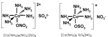 2) isomeria di ionizzazione; analogo al precedente, ma si produce come conseguenza dello scambio di posizione tra un legante ed un controione della sfera esterna. Ad esempio esistono due isomeri del pentaamminocobalto, uno con legante nitrato e controione solfato ed uno viceversa
