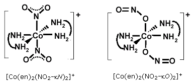 4) Isomeria di legame (linkage isomerism) si manifesta con leganti ambidentati che possono unirsi all'atomo centrale con atomi diversi come nei due isomeri del bis(etilendiammina)dinitritoCobalto(III)