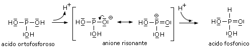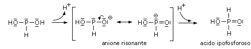 L'acido ortofosforoso H3PO3, ad esempio, in soluzione acquosa è in equilibrio con il suo tautomero, l'acido fosfonico. Uno dei tre ossidrili dell'acido ortofosforoso si dissocia perdendo uno ione H+. L'anione ortofosfito che si genera è descrivibile come un ibrido di risonanza in cui la carica negativa è delocalizzata tra l'atomo di Ossigeno e quello di Fosforo. L'anione può quindi ricatturare lo ione H+ perso in precedenza utilizzando l'atomo di Fosforo (parzialmente negativo), generando in tal modo l'acido fosfonico.