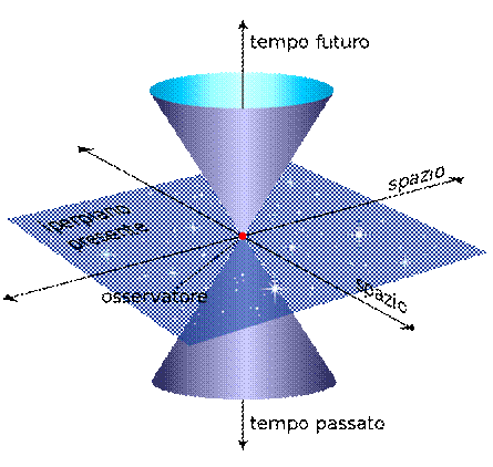 Per ovviare al problema dell'estrema difficoltà di rappresentare in un piano a due dimensioni (il foglio di carta o lo schermo) uno spazio a 4 dimensioni in questo diagramma sono state rappresentate solo le due dimensioni spaziali che formano il piano del presente e la dimensione temporale disposta "verticalmente".