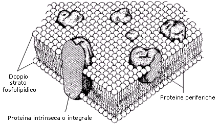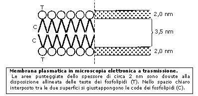 La membrana plasmatica (o plasmalemma) racchiude il contenuto della cellula e costituisce una barriera fra l'ambiente intracellulare (ambiente interno) e quello extracellulare (ambiente esterno). È costituita da un doppio strato continuo di fosfolipidi, dello spessore di 8-10 nm (un nanometro corrisponde a un miliardesimo di metro = 10-9 m), attraversata in parte o completamente da numerose proteine. È inoltre presente una piccola percentuale di glucidi, in forma di glicoproteine e glicolipidi, e di molecole di colesterolo che la stabilizzano, I fosfolipidi sono lipidi formati da una 'testa' di glicerolo legato ad un gruppo fosfato e a due 'code' di acidi grassi. Come conseguenza della presenza di acqua sia all'interno che all'esterno della cellula, i fosfolipidi rivolgono le teste polari verso le due superfici della membrana, mentre le code apolari sono rivolte verso la parte interna del doppio strato