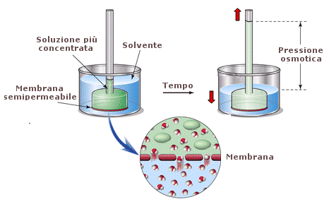 Come conseguenza delle caratteristiche di semipermeabilità della sua membrana, la cellula è soggetta a fenomeni osmotici. L'osmosi è un fenomeno che si manifesta quando una membrana selettivamente permeabile (semipermeabile) separa due soluzioni a diversa concentrazione. La membrana è tale per cui solo le molecole dell'acqua possono liberamente diffondere, mentre la diffusione del soluto è impedita. In queste condizioni l'acqua tende a diffondere dalla soluzione più diluita (dove è presente in quantità maggiore) alla soluzione più concentrata (dove è presente in quantità minore). Il flusso dell'acqua verso la soluzione più concentrata produce una vera e propria pressione (pressione = forza/superficie = forza che agisce sull'unità di superficie), detta pressione osmotica. Il valore della pressione osmotica è direttamente proporzionale alla differenza di concentrazione tra le due soluzioni. Nel caso le due soluzioni poste a contatto siano contenute in recipienti aperti il flusso d'acqua dall'una all'altra produrrà un dislivello che potrà essere utilizzato come misura della pressione osmotica (ricordiamo che 10 metri d'acqua equivalgono alla pressione di 1 atmosfera).