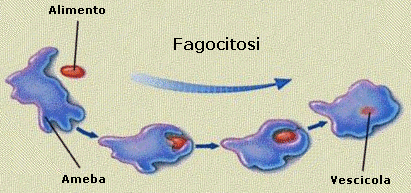 La fagocitosi avviene grazie alla crescita di due estroflessioni, dette pseudopodi (pseudopodio = falso piede), attorno al materiale da inglobare. I pseudopodi crescono fino ad avvolgere il materiale e a fondersi alle sue spalle inglobandolo in una vescicola di fagocitosi. In questo modo, ad esempio, i macrofagi, un particolare tipo di globuli bianchi del nostro organismo inglobano e distruggono i batteri ed eliminano cellule morte e strutture estranee.
