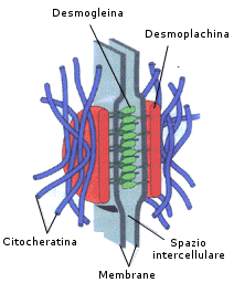 I desmosomi (chiamati anche macula adherens) sono in genere strutture di forma circolare o ellittica. Nella regione contenente un desmosoma è possibile osservare uno spesso strato di materiale denso, la placca, posta immediatamente al di sotto della membrana plasmatica sui due versanti della giunzione. A partire dalla placca, e per una certa distanza in direzione del citoplasma sottostante, si dipartono strutture citoscheletriche ben definite, i filamenti intermedi, detti tonofilamenti, che fungono da ancora citoplasmatica per la giunzione. A seconda del tipo di cellula, essi possono essere costituiti da citocheratina o da vimentina. Le membrane plasmatiche delle cellule che hanno in comune un desmosoma sono tra loro parallele, più o meno allineate e separate da uno spazio di ampiezza costante. Lo spazio extracellulare che le separa è occupato da un fitto intreccio di filamenti sottili e di materiale granulare che va sotto il nome di nucleo del desmosoma. I desmosomi di animali e tessuti diversi contengono proteine rappresentative che sono riscontrabili in modo costante. Tra queste, due delle più grandi, le desmoplachine I e II sono molecole strutturalmente correlate e risultano essere associate alle placche. Un altro gruppo di glicoproteine, le desmogleine, che sono membri della famiglia delle caderine , fungono da ponte citoplasmatico tra le placche ed il materiale extracellulare. Negli animali pluricellulari, i desmosomi congiungono molti tipi diversi di cellule. Queste strutture sono particolarmente abbondanti nei tessuti che sono comunemente sottoposti a stress meccanici in senso laterale o da stiramento, come le cellule dell'epidermide e quelle degli epiteli che rivestono la superficie interna delle cavità corporee.