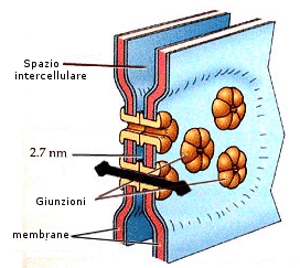 b) Le giunzioni comunicanti (o giunzioni serrate o gap junction) costituiscono un passaggio aperto attraverso cui ioni e piccole molecole possono direttamente passare da una cellula all'altra. In questo tipo di giunzioni, le membrane plasmatiche delle due cellule adiacenti sono separate da uno spazio molto regolare di 2,7 nm. Il termine usato in inglese, gap, sta a indicare questa separazione sorprendentemente regolare. In queste strutture è stata messa in evidenza la presenza di un grande numero di cilindri cavi disposti con l'asse maggiore perpendicolare alla superficie delle cellule che attraversano lo spazio intercellulare delle giunzioni comunicanti.