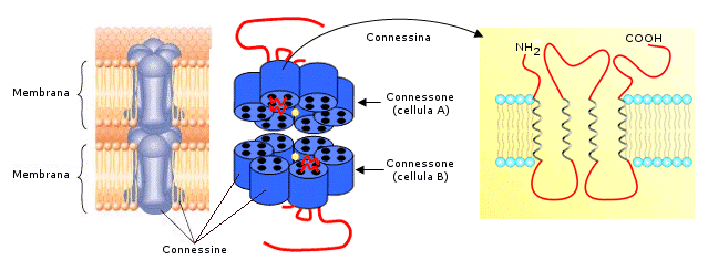 Nei vertebrati, lo stretto canale che si trova al centro del cilindro ha un diametro di circa 1,5 nm nel punto più stretto, dimensione sufficiente a permettere il libero transito di ioni e di piccole molecole. Nelle giunzioni i cilindri appartenenti a due membrane plasmatiche adiacenti si incontrano coda contro coda, e costituiscono un passaggio diretto tra una cellula e l'altra, ma isolano la giunzione rispetto ai liquidi extracellulari. Ogni cilindro della giunzione, definito connessone, è costituito da un numero variabile da 4 a 6 molecole di una proteina detta connessina. A seconda del tipo di cellula dal quale vengono isolate, il peso molecolare delle connessine varia. Le giunzioni comunicanti di un determinato tipo di tessuto possono contenere un unico tipo di connessina o una miscela di due o più tipi diversi. Nonostante le differenze di dimensioni, tutte le connessine hanno una struttura analoga che comprende quattro regioni transmembraniche ad alfa-elica. L'apertura e la chiusura dei canali è regolata dalle cellule. Il sottile strato tra le due cellule impedisce il passaggio di grosse molecole. Sono presenti nel muscolo cardiaco e nei tessuti muscolari lisci.
