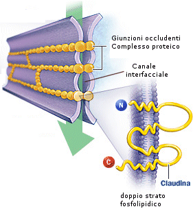 c) Le giunzioni occludenti (o giunzioni strette o tight junction) hanno il compito di chiudere gli spazi intercellulari alla diffusione, in quanto formano una specie di barriera che impedisce il flusso diretto di molecole e di ioni da una cellula all'altra. Le due membrane cellulari sono strettamente cucite insieme da una proteina di membrana (claudina). Sono le giunzioni più forti perché, oltre a solidità meccanica, impediscono il passaggio di acqua e soluti tra le cellule, formando un sigillo che impedisce il passaggio di sostanze fra il dominio extra-cellulare apicale e il dominio basolaterale. Sono poste ad esempio tra le cellule che rivestono l'apparato digerente, impedendo agli acidi ed agli enzimi di danneggiare i tessuti sottostanti.