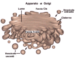 Le proteine che sono state sintetizzate e modificate nel Reticolo endoplasmatico, e da questo rilasciate in vescicole, entrano nel Golgi fondendosi con la faccia Cis. Nel Golgi subiscono ulteriori modifiche mentre sono trasportate verso la faccia trans. Le modalità di migrazione delle sostanze dalla faccia cis verso la faccia trans non sono ancora completamente chiarite.
