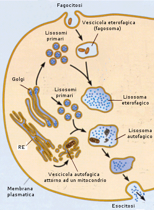 Il lisosoma è una vescicola contenente enzimi idrolitici che si attivano a pH 5. È formato dalla fusione di vescicole idrolasiche del Golgi con vescicole di endocitosi (endosomi). Nelle vescicole idrolasiche del Golgi (o lisosomi primari) sono già presenti gli enzimi litici, ma il pH non è sufficientemente acido perché questi si attivino. Quando si fondono con gli endosomi, i quali sono dotati di pompe protoniche sulla propria membrana in grado di abbassare il pH, gli enzimi vengono attivati e si forma il vero e proprio lisosoma. Esso è ricco di enzimi digestivi in grado di degradare molecole e strutture presenti all'interno della cellula nei loro costituenti elementari per poi venire riutilizzati in altro modo o essere espulsi.