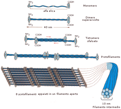 L'elemento di base è un dimero formato da due catene ad alfa elica superavvolte (coiled-coil). I dimeri si appaiano in modo sfalsato ed antiparallelo (estremità ammino-terminale contro estremità carbossi-terminale) a formare tetrametri. I tetrametri si succedono a formare un protofilamento. 2 protofilamenti appaiati formano una protofibrilla. 8 protofilamenti (o 4 protofibrille) si avvolgono a spirale a formare un filamento intermedio