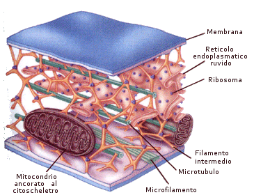 Il citoscheletro è un sistema di filamenti proteici presente nel citosol di tutte le cellule animali e vegetali. È costituito da tre tipi principali di filamenti proteici: microtubuli, microfilamenti e filamenti intermedi, connessi sia tra di loro che con altre strutture cellulari grazie a numerose proteine accessorie. Della struttura quaternaria dei microtubuli (tubulina) e dei microfilamenti (actina) abbiamo già detto (vedi capitolo sulle proteine)