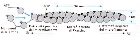 Durante la formazione degli pseudopodi, ad esempio, la cellula costruisce dei microfilamenti nella direzione di avanzamento dell'estroflessione, per dirigerne e sostenerne la crescita. I microfilamenti di actina sono polarizzati (estremità + e -) e si riconoscono non solo da un punto di vista biochimico, ma anche morfologico, perché l'estremità + è appuntita, quella - è sfrangiata. Entrambe le estremità sono siti di crescita con velocità diverse: maggiore nella estremità + e inferiore nella estremità -. La porzione + del filamento di actina rappresenta la zona di attiva crescita e per questo necessita di energia sotto forma di ATP. Se nell'estremità +, i monomeri si legano velocemente, nell'estremità - vengono sottratti monomeri di G-actina che, caricati con ATP si spostano all'estremità positiva per essere assemblati: il risultato è che il filamento, mentre cresce, si sposta. Questo processo viene usato per la formazione di pseudopodi. Quindi, l'avanzamento di un filamento può essere fatto non solo con i monomeri ex-novo, ma anche con unità che derivano dal decremento dell'estremità negativa.