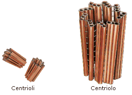 I centrioli sono due piccoli organuli a cilindretto disposti perpendicolarmente l'uno rispetto all'altro, situati vicino alla membrana nucleare e circondati da un materiale proteico amorfo a formare una struttura denominata centrosoma. I centrioli sono formati da 9 triplette di microtubuli saldate tra loro da filamenti proteici.