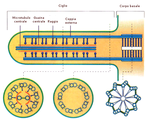 La struttura citoscheletrica interna (assonema) di ciglia e flagelli è identica ed è costituita da 9 coppie di microtubuli disposti ad anello attorno a due microtubuli non accoppiati al centro. Questa struttura, detta 9+2, si ritrova in quasi tutte le forme di ciglia e flagelli eucariotici, dai protozoi all'uomo e funziona da motore del movimento. Le coppie esterne di microtubuli sono collegate tra loro da due braccia di dineina e da connessioni proteiche di nexina.