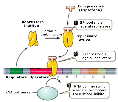 Il repressore del triptofano si lega all'operatore solamente nel caso in cui sia legato al triptofano. Il triptofano presente agisce da corepressore (repressione da prodotto finale), quindi il grado di espressione dei geni per la sintesi del triptofano è inversamente correlato alla presenza di questo aminoacido nel mezzo di coltura.