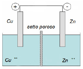 Un elettrodo di Cu è immerso in una soluzione di ioni Cu++ , uno di Zn in una soluzione di ioni Zn++ collegati tramite in filo di rame, che fa da conduttore. Le 2 soluzioni sono separate da un setto poroso, che permette il passaggio degli ioni senza mescolare le soluzioni (serve a chiudere il circuito elettrico).