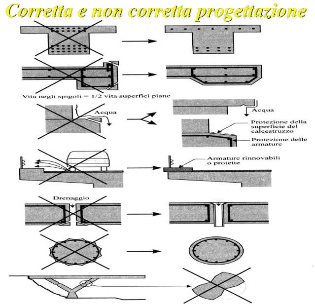 . evitare ristagni d'acqua, infatti l'acqua è l'elemento fondamentale per ogni processo di degrado, l'acqua è necessaria anche per il processo corrosivo allora occorre allontanare l'acqua oppure proteggere superficialmente il cls soprattutto in quei punti dove l'acqua bagna maggiorente il cls, progettare buoni drenaggi