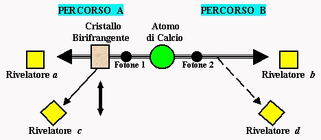 Nella figura di seguito riportata vediamo una schematizzazione delle apparecchiature utilizzate da Aspect e collaboratori nei loro esperimenti. Al centro si trova un atomo di Calcio il cui decadimento produce una coppia di fotoni correlati che si muovono lungo percorsi opposti. Lungo uno di questi percorsi (nel caso rappresentato in figura, il Percorso A), di tanto in tanto e in maniera del tutto casuale, viene inserito un 'filtro' (un Cristallo Birifrangente) il quale, una volta che un fotone interagisce con esso, può, con una probabilità del 50 %, deviarlo oppure lasciarlo proseguire indisturbato per la sua strada. Agli estremi di ogni tragitto previsto per ciascun fotone è posto un rivelatore di fotoni.