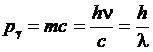 La relazione che nella relatività speciale lega l'energia totale (E), l'energia a riposo (Eo) e la quantità di moto p = mv è infatti E2 = (pc)2 + Eo2. Poiché non possono esistere fotoni fermi, l'energia a riposo di un fotone vale zero e la relazione per un fotone diventa E = pc.