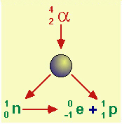 Fig.11.2 Schema che rappresenta il bombardamento di un atomo con una particella e la relazione tra neutrone n, elettrone e, protone p. Nello schema, una particella bombarda un atomo; ciò può provocare l'emissione di un protone p o di un neutrone n; il neutrone è relativamente instabile e può scindersi in un elettrone e più un protone p. Il numero intero in alto a sinistra della particella (o del simbolo dell'atomo) rappresenta il numero di massa della particella, quello in basso a sinistra la sua carica elettrica (nel caso di atomi, il suo numero atomico Z, corrispondente al numero di protoni, perciò al numero di cariche elettriche positive del nucleo). In una reazione nucleare la somma dei numeri di massa nel primo membro dell'equazione deve essere eguale a quella dei numeri nel secondo membro; analogamente, la somma algebrica delle cariche nel primo membro dell'equazione deve essere eguale a quella delle cariche nel secondo membro. |