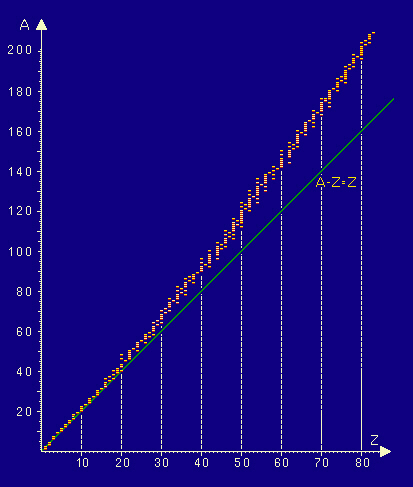 Nella figura sono riportati, in funzione di Z e di A, tutti i nuclidi stabili, cioè tutti quelli riscontrati in natura; mancano perciò quelli artificiali e quelli radioattivi; in particolare si può notare la mancanza di Z=43 (tecnezio Tc) e di Z=61 (promezio Pm), artificiali, benché a Z relativamente basso (ma dispari per ambedue). Il grafico si ferma a Z=83 (bismuto Bi), poiché tutti i nuclidi con Z>83 sono instabili e radioattivi, e molti di essi artificiali.