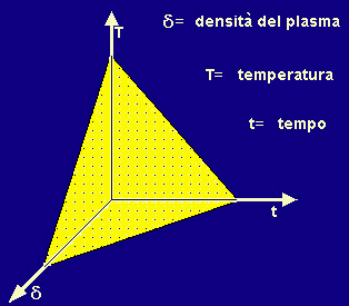 Fig.11.10 Superficie limite per il mantenimento delle condizioni di fusione. Il problema è quello di raggiungere e mantenere contemporaneamente alti valori per: temperatura T, densità del plasma d, tempo t. In varie occasioni si sono superati i limiti per uno o due dei parametri, ma non molte sono le esperienze in cui tutti i tre i parametri sono stati superiori al minimo. Praticamente occorre che tutti i tre parametri corrispondano a punti al di sopra della superficie indicata, che si può considerare una superficie limite. |