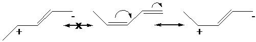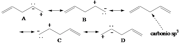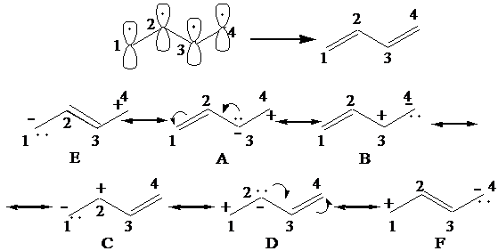 La sovrapposizione degli orbitali p 1-2 e 3-4 porta alla formazione di 2 legami p coniugati, per i quali sono possibili varie forme di risonanza. Le forme A,B,C,D sono quelle previste per due legami p semplici (non coniugati). Sono però possibili altre due forme in risonanza, E e F, che derivano dalla sovrapposizione degli orbitali 2,3.