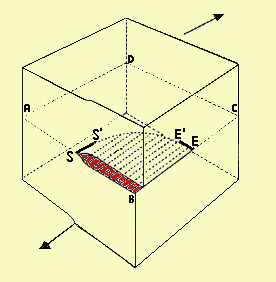 Fig.22.1 Difetto reticolare: linea di dislocazione. Una estremità è un asse elicogiro (screw SS'), l'altra uno spigolo puro (EE'). Lo slittamento avviene sull'area ombreggiata. Questo fenomeno avviene frequentemente quando lo sviluppo del cristallo avviene lungo gli spigoli (come se le unità elementari che via via si aggiungono seguissero un andamento a spirale lungo i vari spigoli). In questo caso AD è uguale a BC, ma lo strato superiore al piano ABCD presenta una lunghezza inferiore per BC che per AD (potrebbe mancare, per esempio, una unità strutturale). La conseguenza è che lo spigolo verticale centrale non parte da B ma un po' più a destra; il difetto (o mancanza di materiale) risiede nella parte colorata in rosso. |