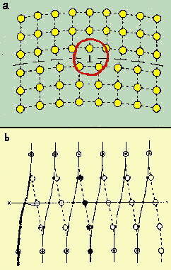 Fig.22.2 Difetti reticolari: a) dislocazione di una unità di spigolo. All'altezza del cerchio rosso è evidente, rispetto al terzo strato dall'alto la mancanza di una unità strutturale nel quarto strato. Questa situazione viene poi ripetuta negli strati inferiori 5 e 6. Si parla, in questo caso, di 'vacanza reticolare', che risiede al centro del cerchio rosso. b) dislocazione di una unità sull'asse elicogiro; i cerchi pieni rappresentano atomi sopra, quelli vuoti sotto. Mentre nel primo strato dall'alto e nel quinto c'è una perfetta corrispondenza tra gli atomi superiori e gli inferiori, la deformazione fa sì che, nel terzo strato gli atomi inferiori e superiori siano perfettamente sfasati; negli strati secondo e quarto esiste una situazione intermedia, di transizione. |