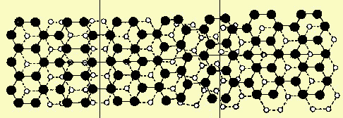 Fig.22.3 Difetto reticolare di impaccamento tra due strati con dislocazioni parziali nella grafite. Nelle posizioni estreme, a sinistra e a destra, gli atomi di C dello strato sottostante (atomi chiari) compaiono esattamente al centro dell'esagono superiore (atomi in nero). Partendo da sinistra si nota una deformazione del reticolo con sfasamento degli atomi inferiori rispetto a quelli superiori, fino a raggiungere una situazione simile a quella iniziale. |