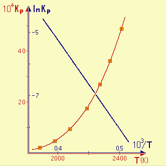 Fig.22.7 Diagrammi per la reazione endotermica, in fase gassosa, di formazione del monossido di azoto dagli elementi. Diagramma Kp contro T relativo alle coppie di valori delle Kp e delle T per una reazione endotermica, in fase gassosa, di formazione di monossido di azoto dagli elementi (diagramma, dati e grafico in rosso); la curva rappresenta un ramo di parabola. Diagramma ln Kp contro 103/T relativo alle coppie dei valori precedenti rielaborati, per la stessa reazione endotermica (diagramma, dati e grafico in blu); l'andamento è lineare e con pendenza negativa. |