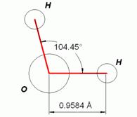 Con diversi sistemi si è potuto misurare l'angolo formato dai due legami O-H che è di 104.45° e la lunghezza del legame stesso che è di 0.9584 A.