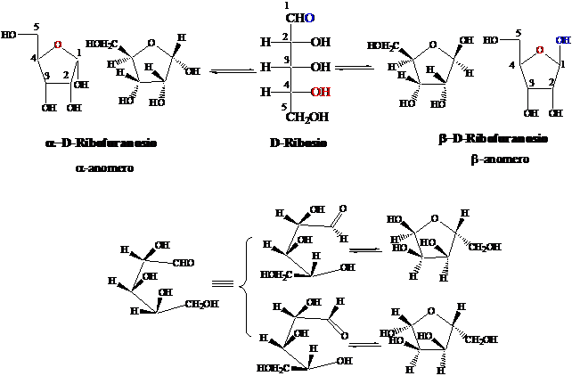 Formazione di un legame emiacetalico per addizione intramolecolare del gruppo C4-OH sul carbonio carbonilico C1. Si forma un composto ciclico pentatomico con struttura simile al furano, da cui il nome di furanosio. Gli emiacetali furanosici si scrivono, per convenzione, con il C1 a destra e l'ossigeno in alto; in questo modo il carbonio C(5) (gruppo CH2OH) si viene a trovare sopra al piano. Gli ossidrili legati a C(2) e C(3), che nelle formule di Fischer si trovano a destra, nella forma furanosica si trovano soto al piano. Nella struttura furanosica il C(1) diventa stereocentro; si creano due diasteroisomeri, chiamati a-anomero (OH sotto al piano) e b-anomero (OH sopra al piano)