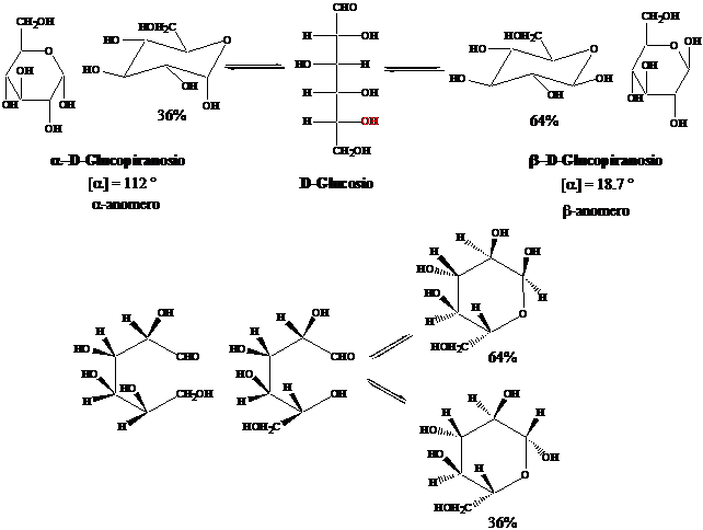 aperta. Poiché il b-anomero è più stabile dell'a-anomero, all'equilibrio i due anomeri sono