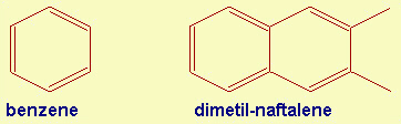 Fig.17.2 Rappresentazione convenzionale delle molecole di benzene e di dimetilnaftalene. I due tratti diagonali sulla seconda molecola rappresentano i due metili. |