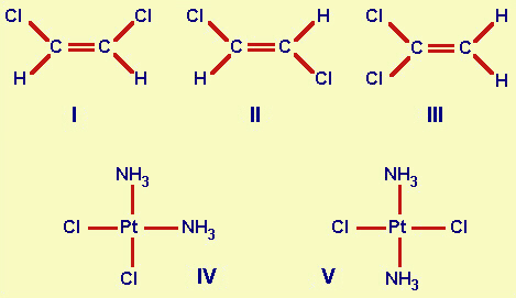 Fig.17.3 Esempi di isomeri di configurazione: I e II, sono rispettivamente cis- e trans-1,2 dicloro etilene. Notare che la molecola III, 1,1 dicloro etilene, non è un isomero di configurazione rispetto a I e II, bensì un isomero di costituzione. IV e V, sono rispettivamente cis- e trans-diammino dicloro Pt (II). |