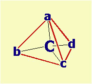Fig.17.6 Atomo di C asimmetrico La struttura spaziale è tetraedrica; a, b, c, d rappresentano possibili sostituenti degli H della molecola di metano. Se i quattro sostituenti sono tutti diversi tra loro, allora C è asimmetrico, cioè una sua immagine speculare non è sovrapponibile a quella originaria. |