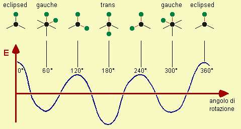 Fig.17.7 Conformeri della molecola di 1,2-dicloro etano e relativa energia. Sono indicate le posizioni successive dei due Cl (in verde) per rotazione di 60° rispetto alla precedente, fino a raggiungere, dopo 360°, la posizione iniziale eclipsed (nascosto, poiché i due sostituenti ingombranti, i Cl, molto più grandi di H, sono uno dietro l'altro). Le conformazioni gauche e trans sono dette 'sfalsate'. In corrispondenza ad ogni rotazione è indicata l'energia del sistema; la curva che rappresenta la variazione di energia al variare della rotazione è una sinusoidale asimmetrica. La conformazione trans è la più stabile perché comporta la minima repulsione elettronica fra i due Cl, mentre la meno stabile è la eclipsed. |