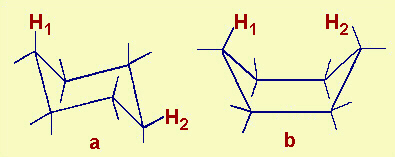 Fig.17.8 Conformazione a sedia (a) e a vasca (b) per la molecola di cicloesano; ogni trattino rivolto verso l'esterno indica un legame CH. E' evidente che esistono interazioni diverse fra i vari H a seconda della conformazione (per esempio H1 e H2 saranno soggetti a repulsione elettronica maggiore nel caso b); perciò la conformazione a vasca sarà ad energia maggiore di quella a sedia, a, in cui i legami CH sono o paralleli al legame C-H1 o diretti radialmente verso l'esterno come C-H2. |
