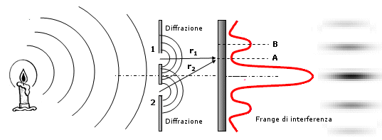 Egli costruì una sorgente luminosa puntiforme facendo passare la luce di una candela attraverso un minuscolo foro praticato su di un foglio di stagno. Al di là di questo primo foglio ne pose un secondo con due piccoli fori, dietro ai quali mise un schermo. Ora se la luce si propagasse rigorosamente in linea retta si otterrebbero sullo schermo due punti luminosi, lungo le rette congiungenti il primo foro con gli altri due. In realtà grazie al fenomeno di diffrazione i due pennelli di luce si allargano e formano due macchie di luce circolari che si sovrappongono sullo schermo. Osservando questa regione di sovrapposizione Young si accorse che essa era solcata da linee sottili chiare e scure che chiamò frange di interferenza.