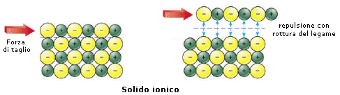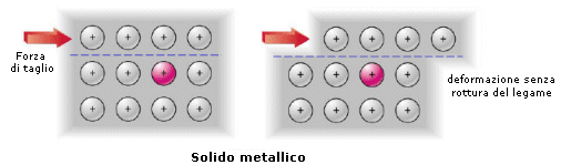 Se ad esempio sottoponiamo un solido metallico ed un solido ionico ad una forza di taglio che faccia slittare reciprocamente un piano di atomi rispetto ad un altro, possiamo notare che: