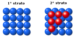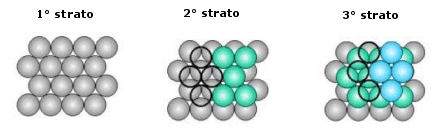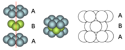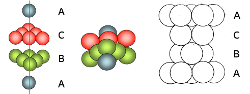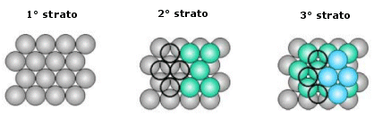 Le sfere del secondo strato giacciono nelle depressioni create dal primo strato, mentre le sfere del terzo strato giacciono nelle depressioni create dal secondo strato in modo da trovarsi esattamente sopra le sfere del primo strato