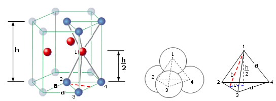 12 atomi sono disposti ai vertici di un prisma a base esagonale, 2 atomi al centro di ciascuna base e 3 atomi all'interno della cella, a metà altezza, a formare i vertici di un triangolo equilatero